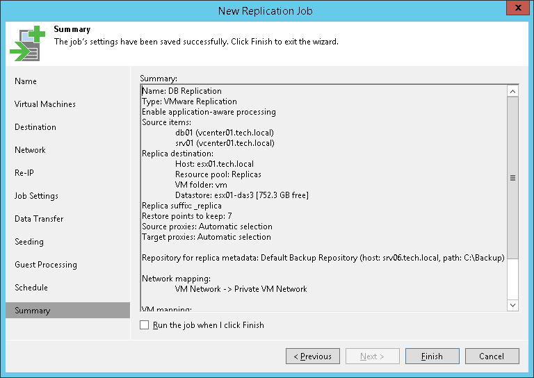 At the Summary step of the wizard, review details of the replication job. If you want to start the job right after you close the wizard, select the Run the job when I click Finish check box, otherwise leave the check box unselected. Then click Finish to close the wizard.
