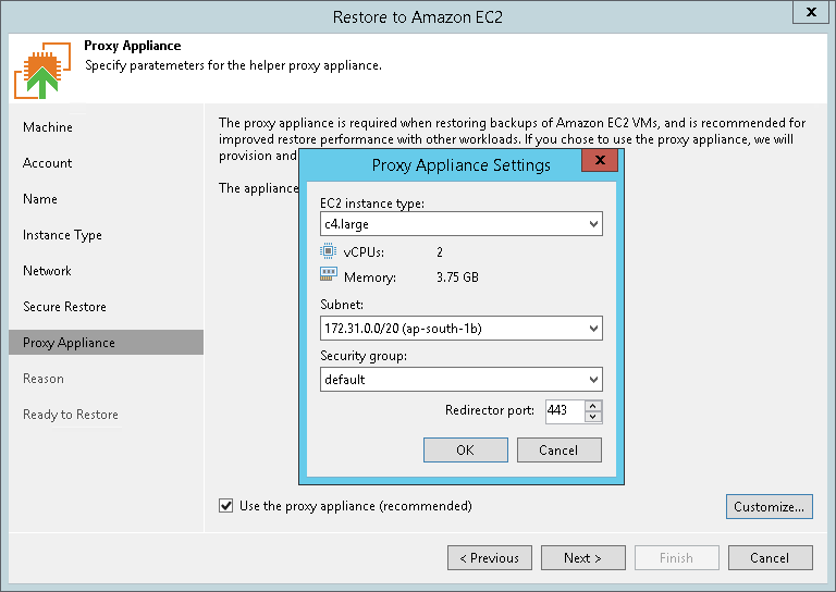 At the Proxy Appliance step of the wizard, you can specify proxy appliance settings. A proxy appliance is an auxiliary Linux-based instance used to upload disks of a backed-up workload to Amazon EC2. For more information on the proxy appliance and requirements for it, see Proxy Appliance.