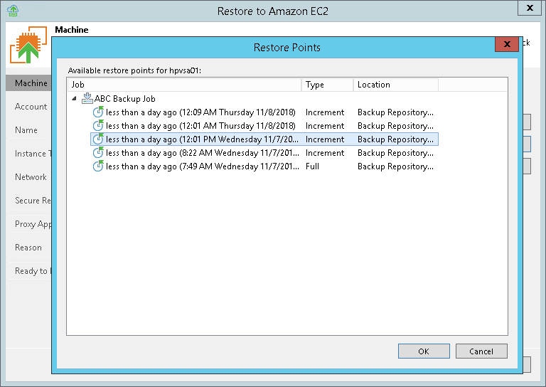 - In the Restore Points window, select a restore point to which you want to restore the workload.