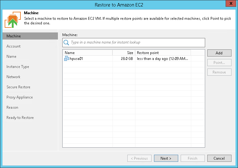 At the Machine step of the wizard, specify workloads that you plan to restore and restore points to which you want to restore the workloads. By default, Veeam Backup & Replication restores workloads to the latest valid restore point in the backup chain.