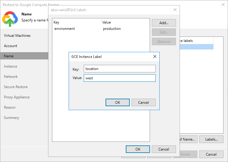At the Name step of the wizard, you can specify names and manage Google labels for the restored workloads. By default, Veeam Backup & Replication uses original workload names.