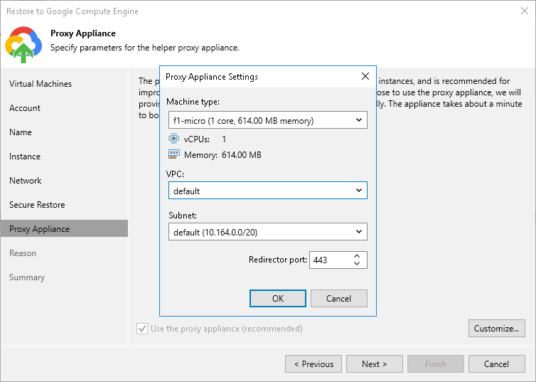 At the Proxy Appliance step of the wizard, you can specify proxy appliance settings. A proxy appliance is an auxiliary Linux-based instance used to upload disks of a backed-up workload to Google Compute Engine. For more information on the proxy appliance and requirements for it, see Proxy Appliances.