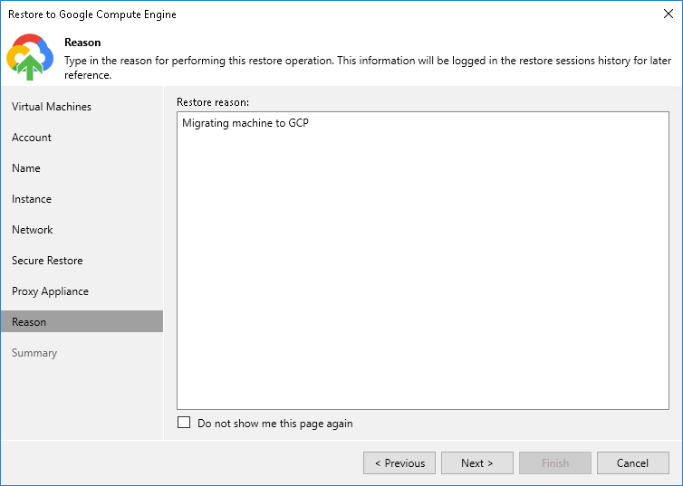 At the Reason step of the wizard, enter a reason for restoring the workload. The information you provide will be saved in the session history in Veeam Backup & Replication, and you can view it later.