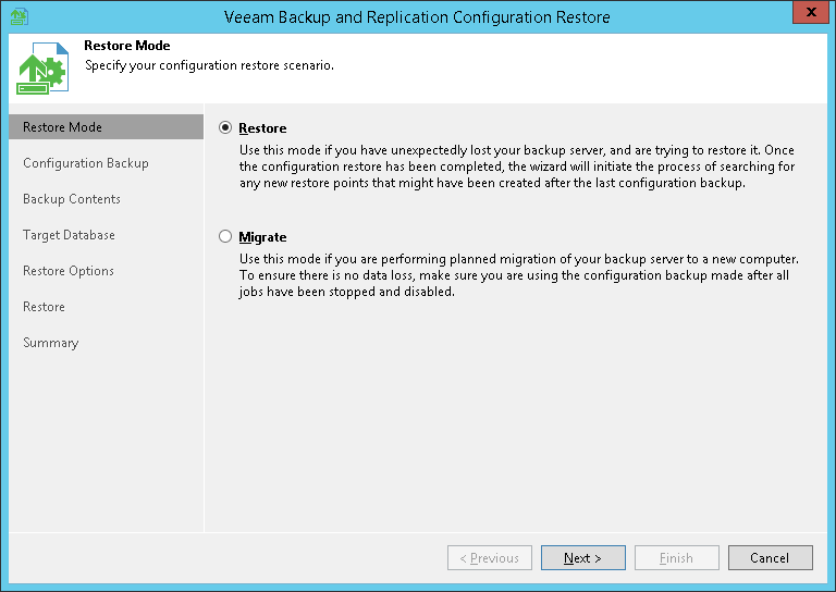 - Select Migrate if you want to restore data from the configuration backup to the database used by another backup server.