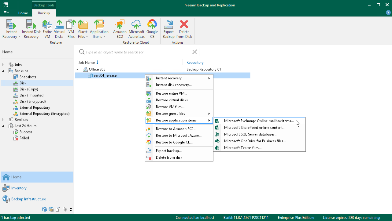 - In the working area, select the necessary machine in the backup or VM replica and click Application Items > Microsoft Exchange on the ribbon. Alternatively, right-click the machine or VM replica and select Restore application items > Microsoft Exchange mailbox items.
