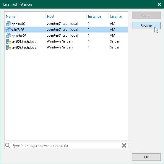 - In the displayed window, select a protected workload or a licensed host and click Revoke. Veeam Backup & Replication will revoke the license from the selected object, and the license will be freed for other objects in the backup infrastructure.