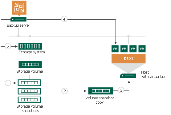 To start a VM from a storage snapshot in On-Demand Sandbox, Veeam Backup & Replication needs to present this storage snapshot to an ESXi host as a datastore. To do this, Veeam Backup & Replication performs the following actions: