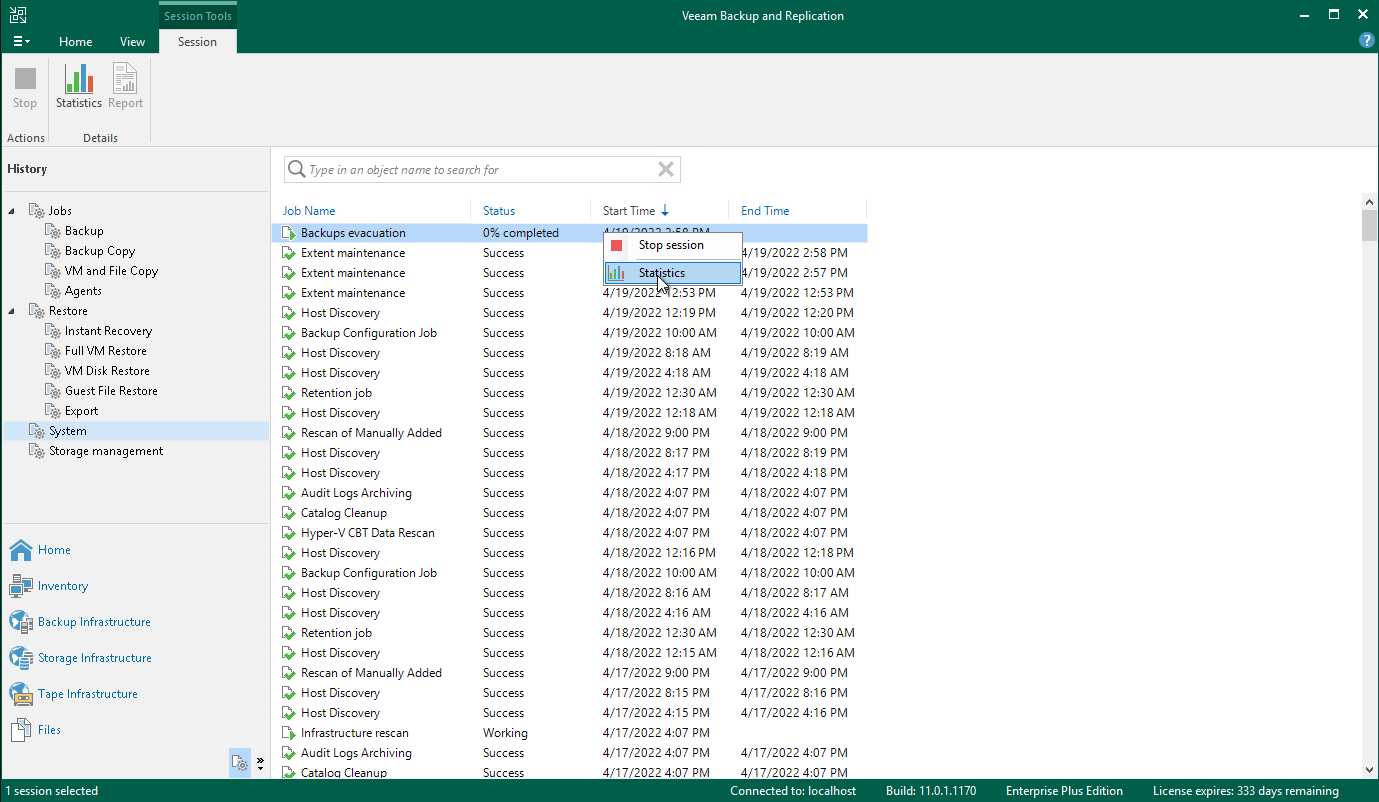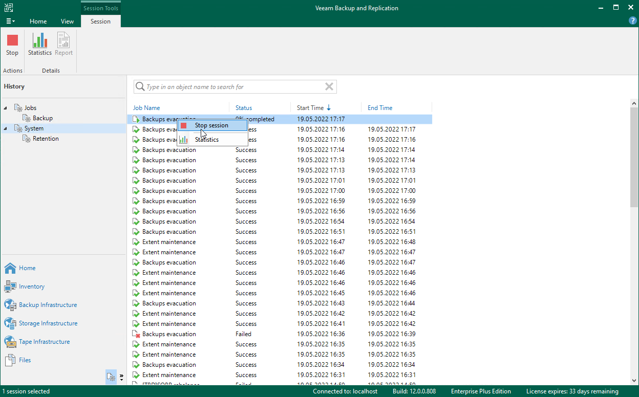 - In the working area, select the evacuation session and click Stop session on the ribbon or right-click the evacuation session and select Stop session.