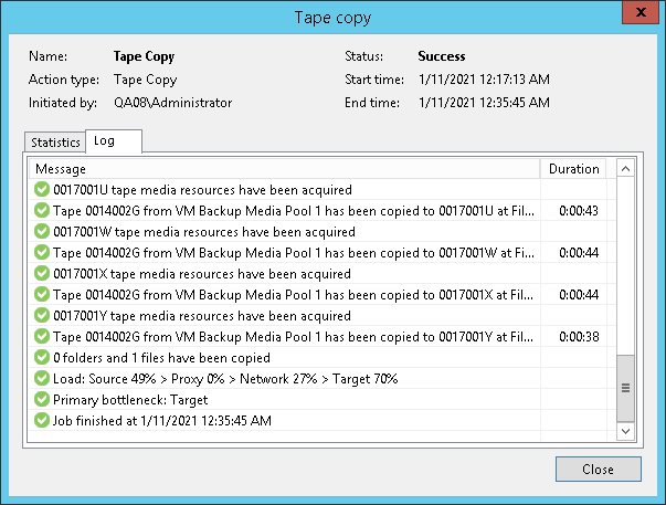 To get an email report about the results of the tape copy job processing, enable notifications as described in Configuring Global Email Notification Settings. If there are too many issues reported after the tape copy job, the job session log in Veeam Backup & Replication UI displays only first 10 files that failed to be copied. For a full list of errors with detailed paths and tape IDs, open the detailed report in the CSV format stored in the folder where tape verification job logs are stored. For convenience, the path to this folder is specified in the job session log in UI and in the email report.