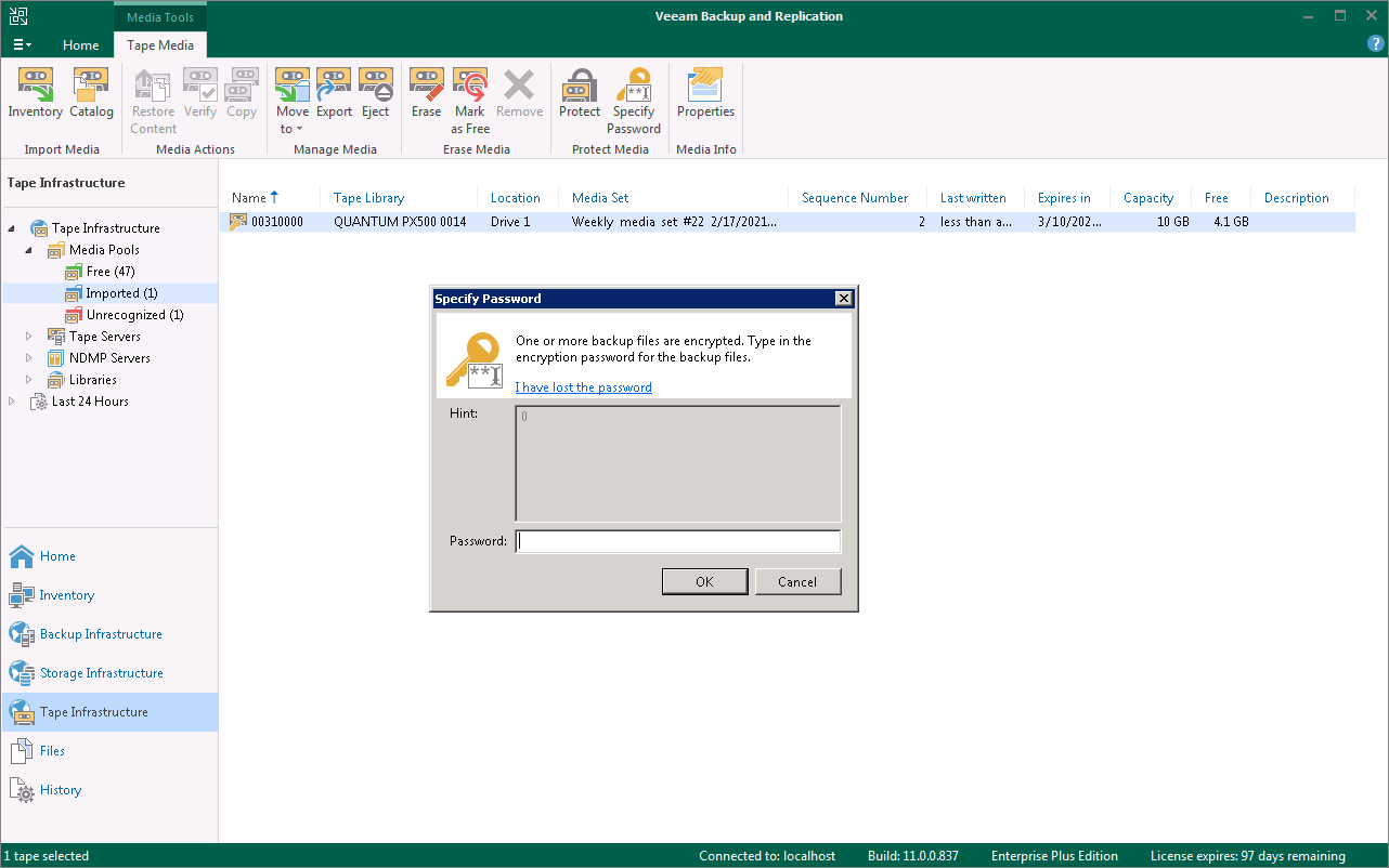 - Select the imported tape and click Specify Password on the ribbon or right-click the tape and select Specify password.