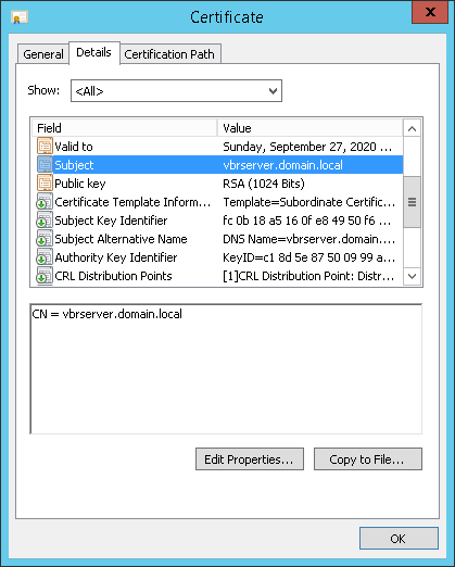 - The certificate subject is equal to the fully qualified domain name of the Veeam Backup & Replication server. For example: vbrserver.domain.local.