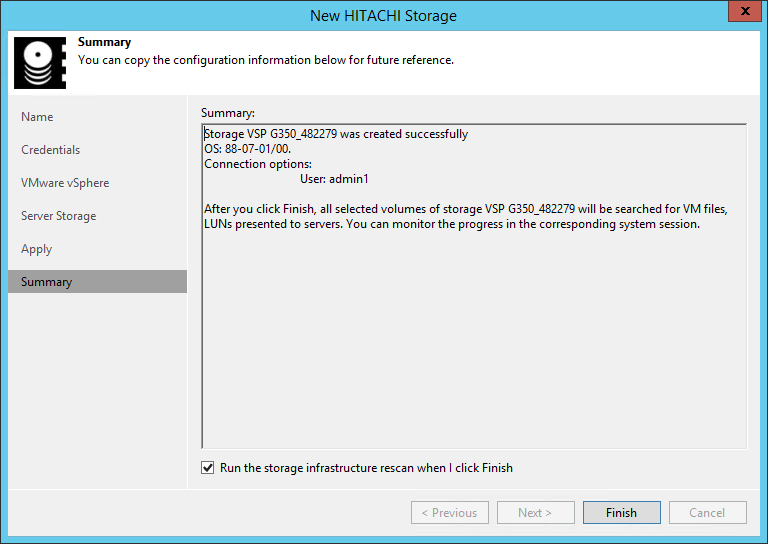 Select the Run the storage infrastructure rescan when I click Finish check box if you want to start the rescan right after you finish working with the wizard. For more information on the rescan process, see Rescan (Storage Discovery) Process.