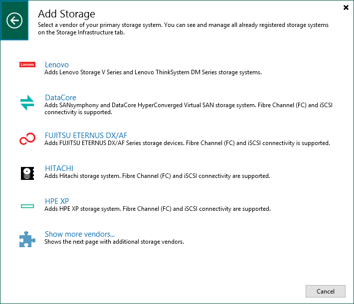 - In the Add Storage window, click Show more vendors and select the storage system that you want to add.