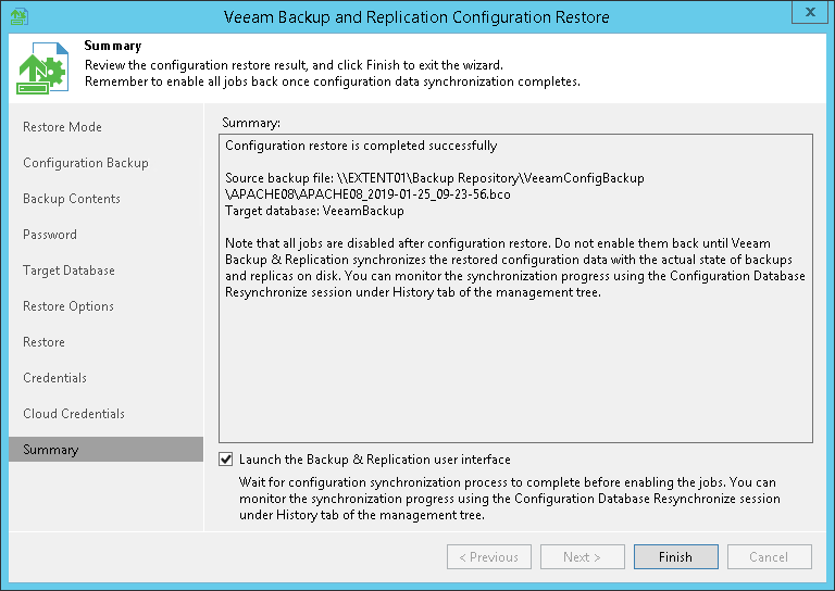 At the Summary step of the wizard, finalize the process of configuration data restore.