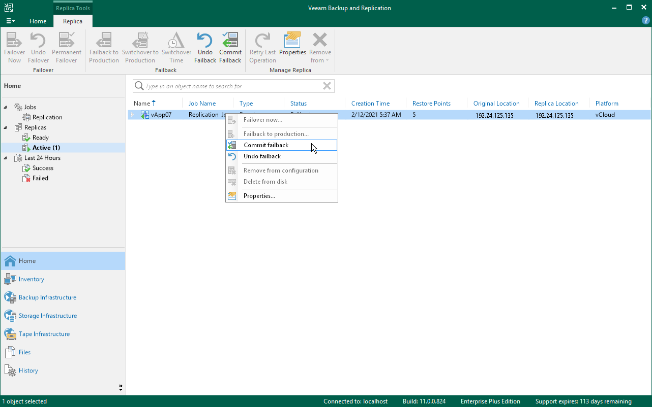 - Open the Home view, in the inventory pane select Replicas. In the working area, select the necessary replica and click Commit Failback on the ribbon. In the displayed window, click Yes to confirm the operation.