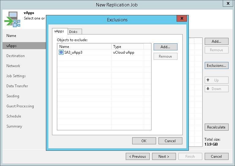 After you have added vApps or VM containers to the replication job, at the vApps step of the wizard you can specify which objects you want to exclude from the replication job.