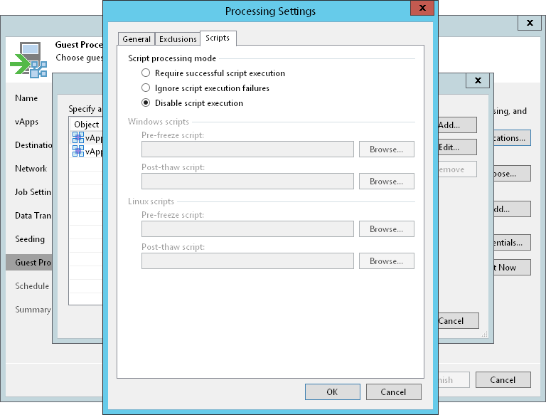 - In the Windows scripts section, specify paths to pre-freeze and post-thaw scripts for Microsoft Windows VMs. For the list of supported script formats, see Pre-Freeze and Post-Thaw Scripts.
