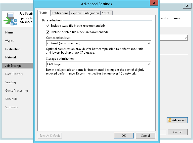 - In the Storage optimization section, select what type of backup target you plan to use. Depending on the selected type, Veeam Backup & Replication will use different data block sizes to process VMs. For more information on the available storage optimization options, the used data blocks and how they affect performance, see Storage Optimization.