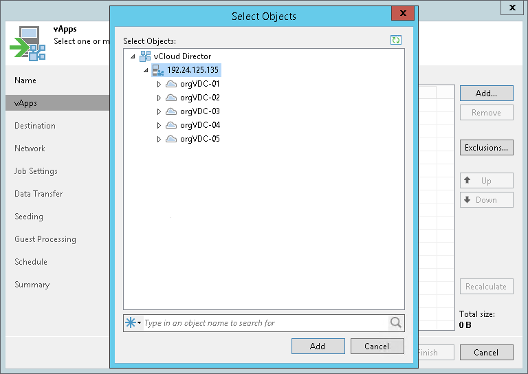 - In the Selects Objects window, select the necessary vApps or VM containers. Click Add.