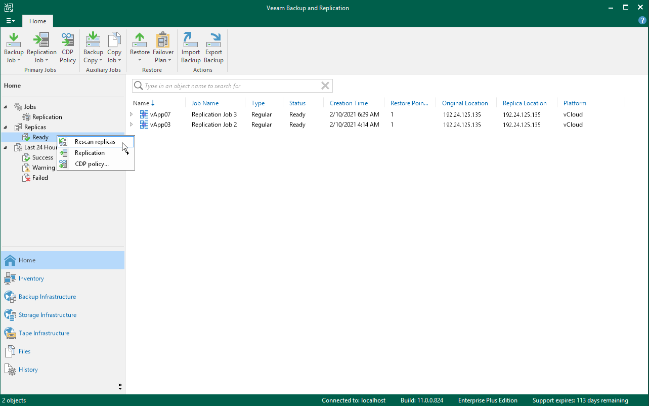 - In the inventory pane, right-click the Replicas node and select Rescan replicas.
