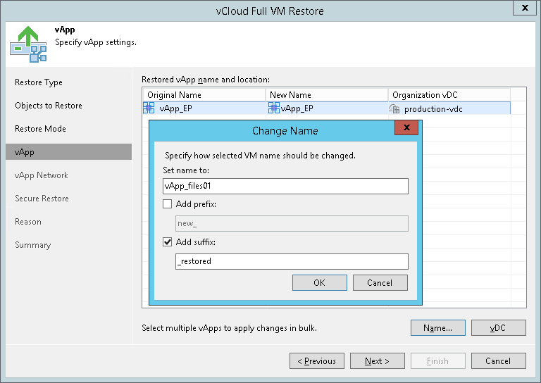 - You can also change the vApp name directly in the list: select a vApp, click the New Name field and enter the name to be assigned to the recovered vApp.