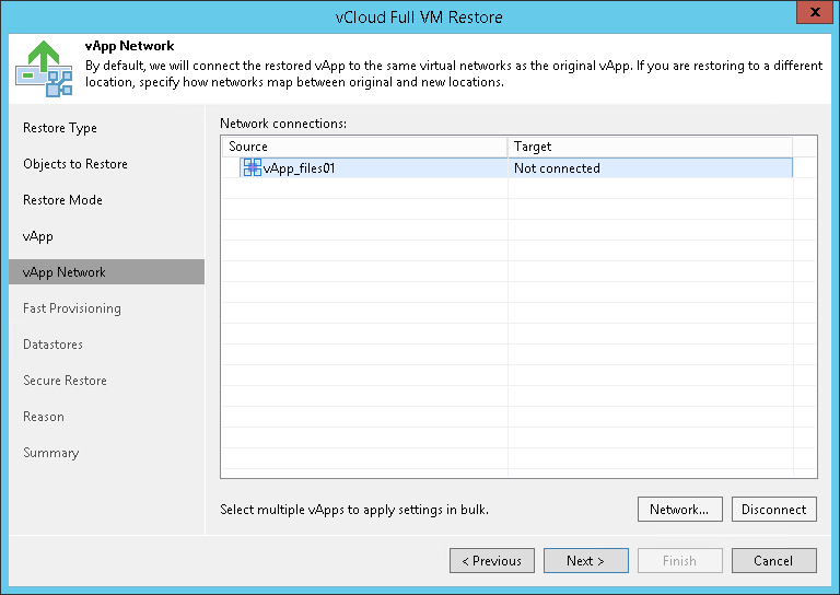 To prevent the restored vApp from accessing any network, select it in the list and click Disconnect.