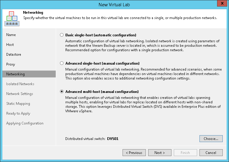 If you select the Advanced multi-host option, click Choose and select the necessary DVS in your virtual environment. Note that Veeam Backup & Replication does not configure a DVS automatically: you must configure it beforehand.