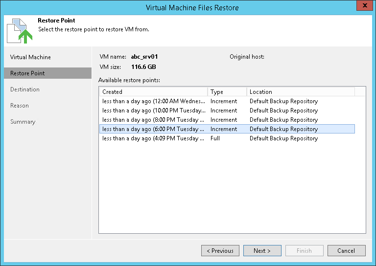 This is an archive version of the document. To get the most up-to-date information, see the current version. Step 3. Select Restore Point At the Restore Point step of the wizard, select a restore point from which you want to restore VM files. Related TopicsBackup RepositoryObject Storage Repository