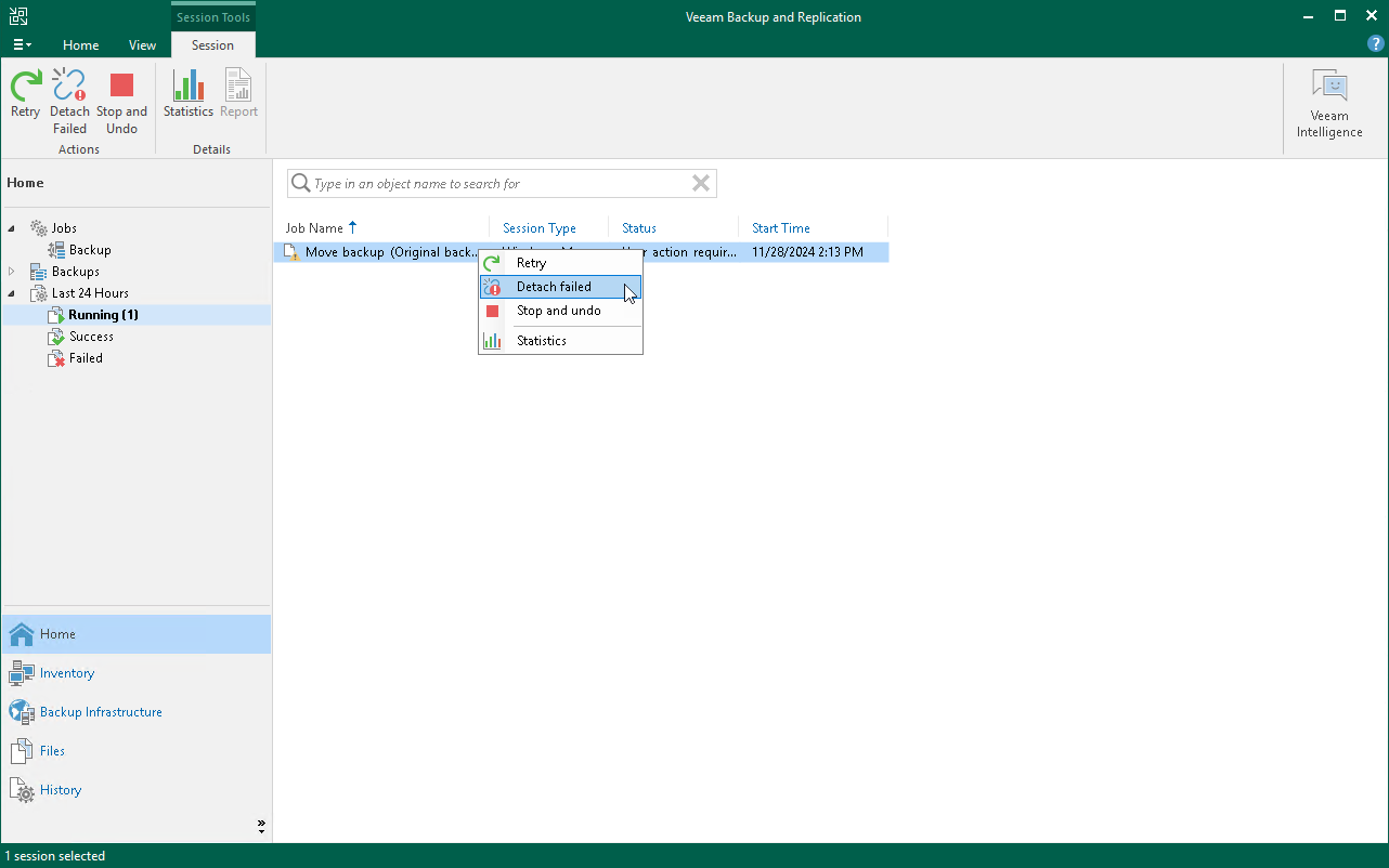 - Right-click the failed move session and select the required action or select the required action on the ribbon: