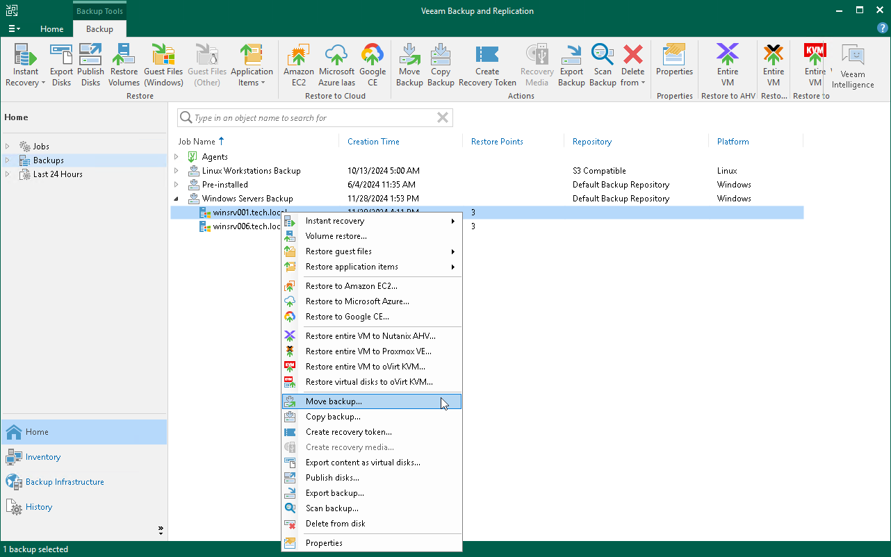 - In the working area, expand the backup whose files you want to move, right-click the backup and select Move backup or click Move backup on the ribbon.