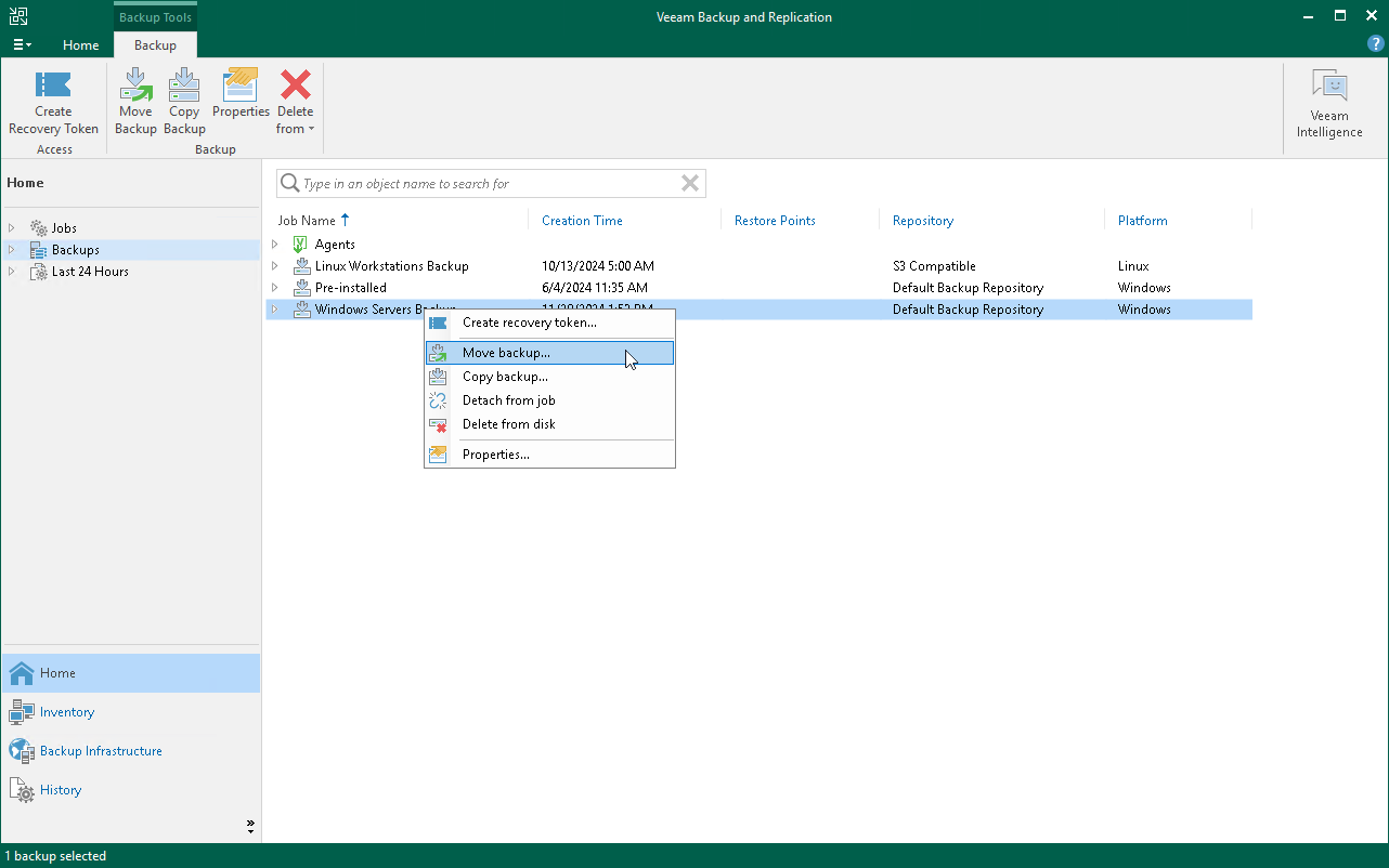 - Right-click the job or the policy and select Move backup. Alternatively, click Move Backup on the ribbon.