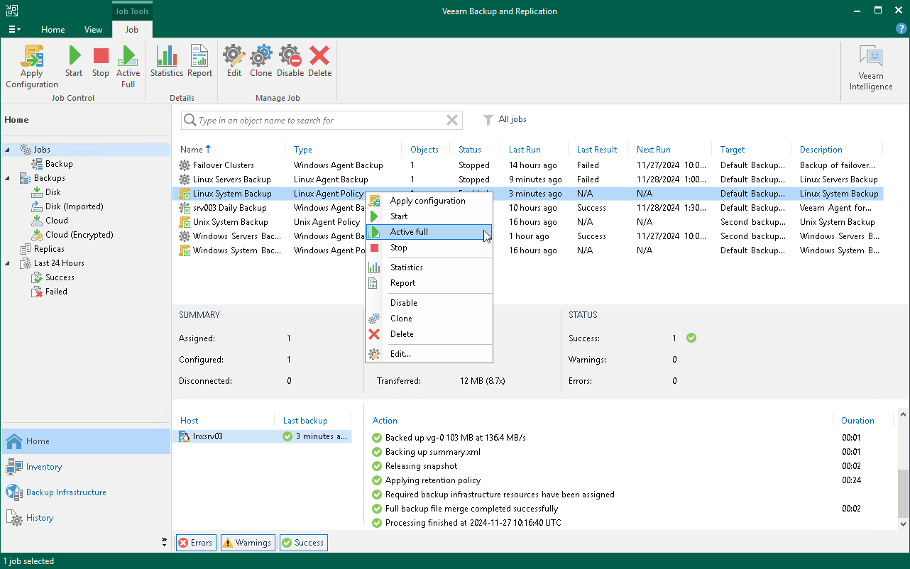 4. In the bottom part of Veeam Backup & Replication, find the list of computers that are processed by the selected backup policy. In the list, right-click the computer and click Active full.