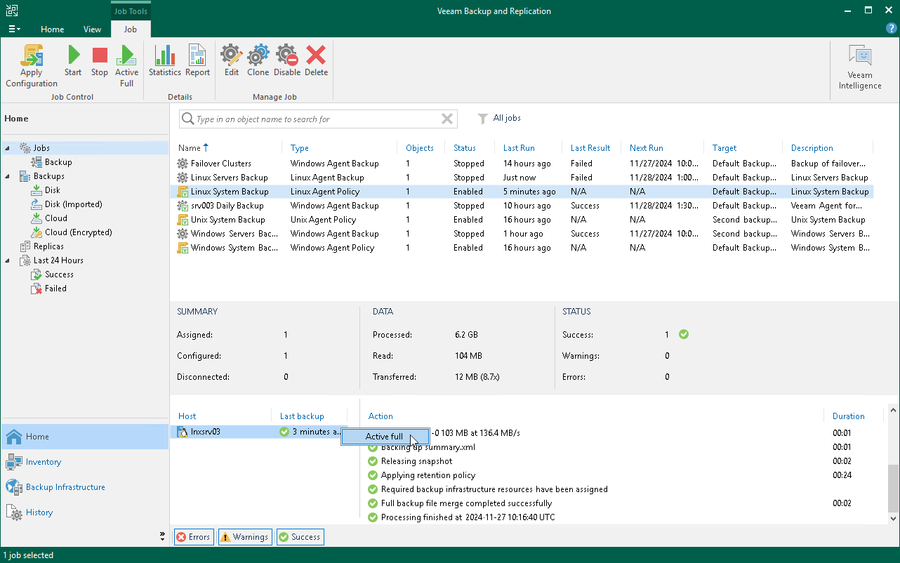 Keep in mind that you cannot start active full backup for protection groups for pre-installed Veeam Agents and their members. Veeam Agent computers included in such protection groups will be skipped and Veeam Backup & Replication will display a warning message in a backup policy session statistics.