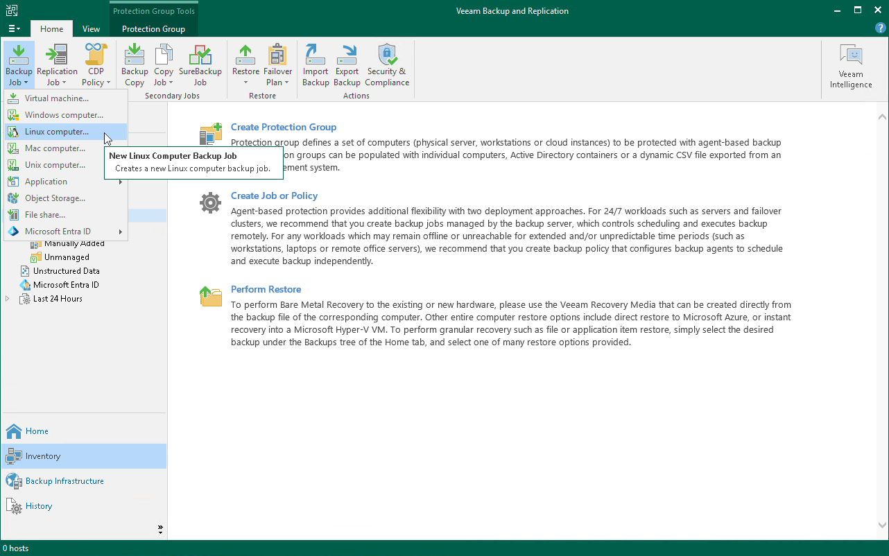 - Open the Home view. Select the Jobs node and click Backup Job > Linux computer on the ribbon.