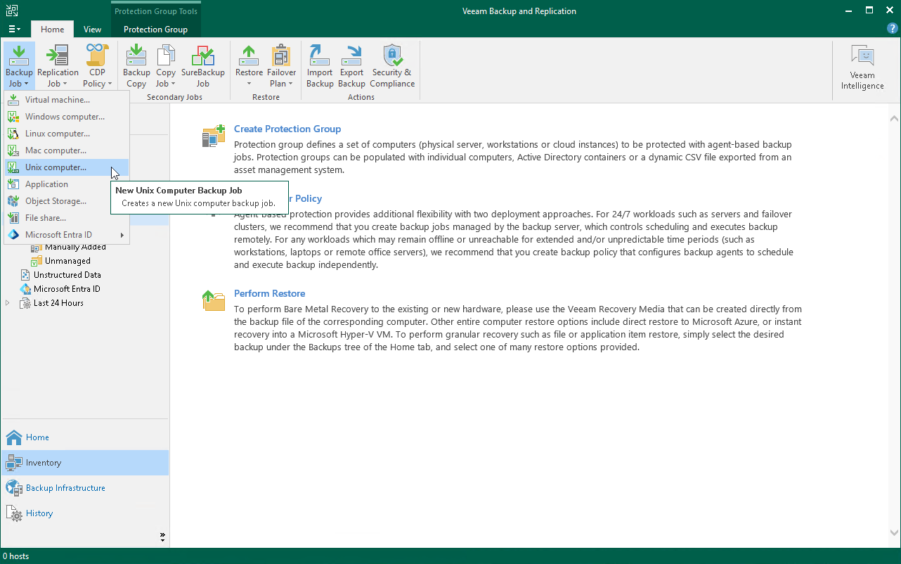 - Open the Home view. Select the Jobs node and click Backup Job > Unix computers on the ribbon.