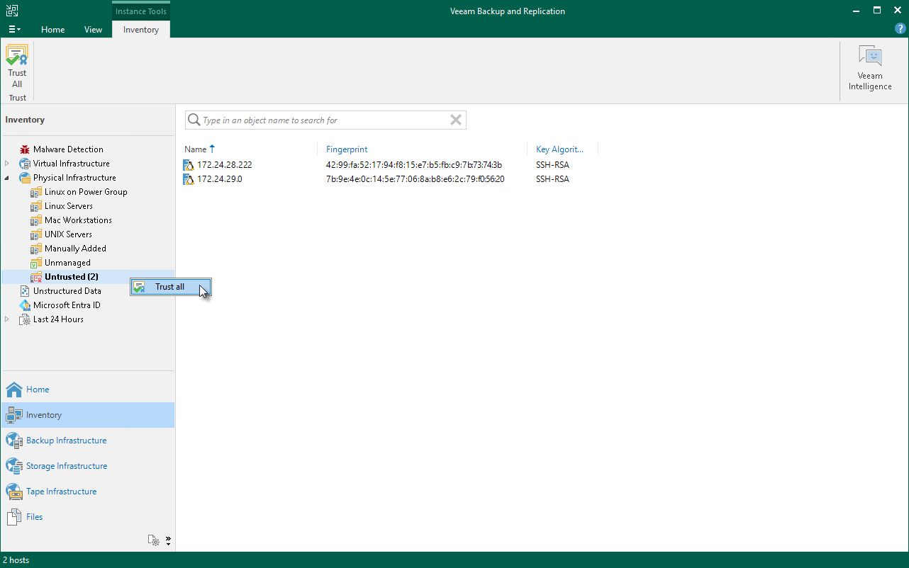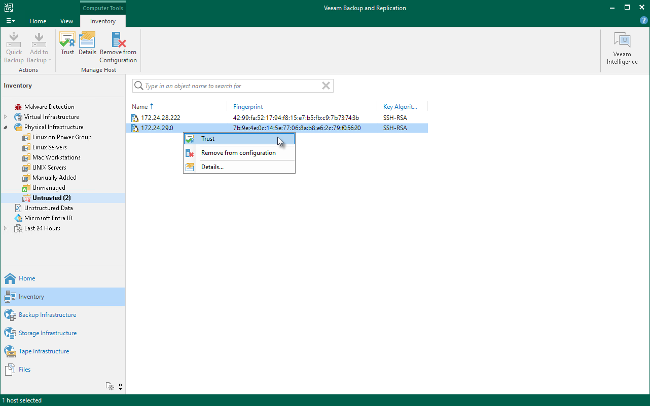 After you enable the Add unknown hosts to the list manually (more secure) option in Veeam Backup & Replication settings, Linux-based computers whose SSH fingerprints are not stored in the Veeam Backup & Replication database become unable to communicate to the Veeam backup server. During discovery, Veeam Backup & Replication puts such computers to the Untrusted protection group. To start managing an untrusted computer, you must manually validate the SSH fingerprint and add the computer to the list of trusted hosts in the Veeam Backup & Replication console.