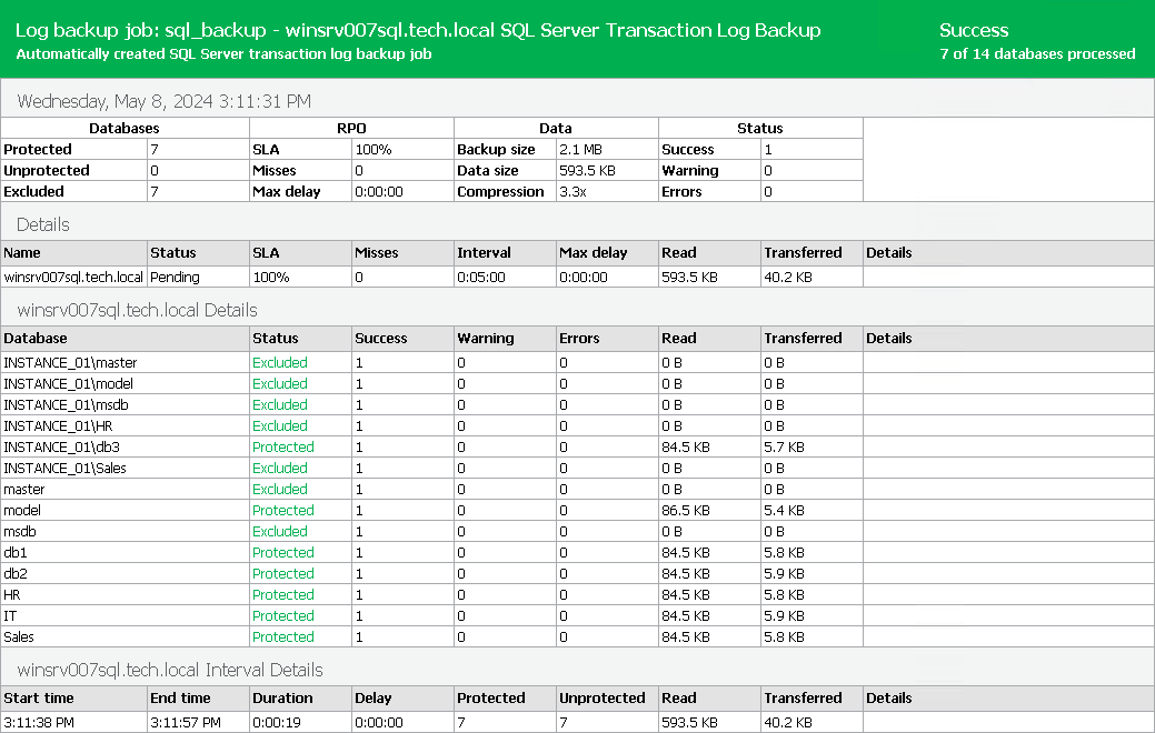If you configure a backup job or backup policy to back up Microsoft SQL Server transaction logs, you can generate a report with details about the SQL Server transaction log backup job session performed on protected computers. For more information about backup of Microsoft SQL Server transaction logs, see Microsoft SQL Server Transaction Log Settings.