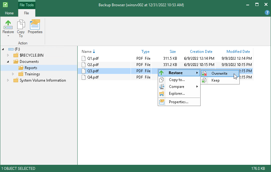 - Locate the file you want to restore, right-click it and select Restore > Overwrite. The file will be restored to its original location.