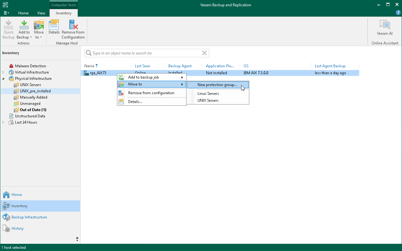 If the Unix computer is in the scope of the backup job as a member of a protection group, after you move the Veeam Agent computer to another protection group, you must add the protection group that contains the moved machine to the backup job.