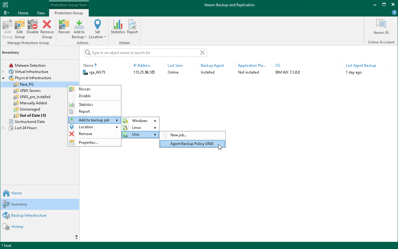 - In the Physical Infrastructure node, select the protection group where you moved the Unix computer; then select Add to Backup > Unix > Agent Backup Policy UNIX on the ribbon. Alternatively, right click the protection group where you moved the Unix computer and select Add to Backup Job > Unix > Agent Backup Policy UNIX.
