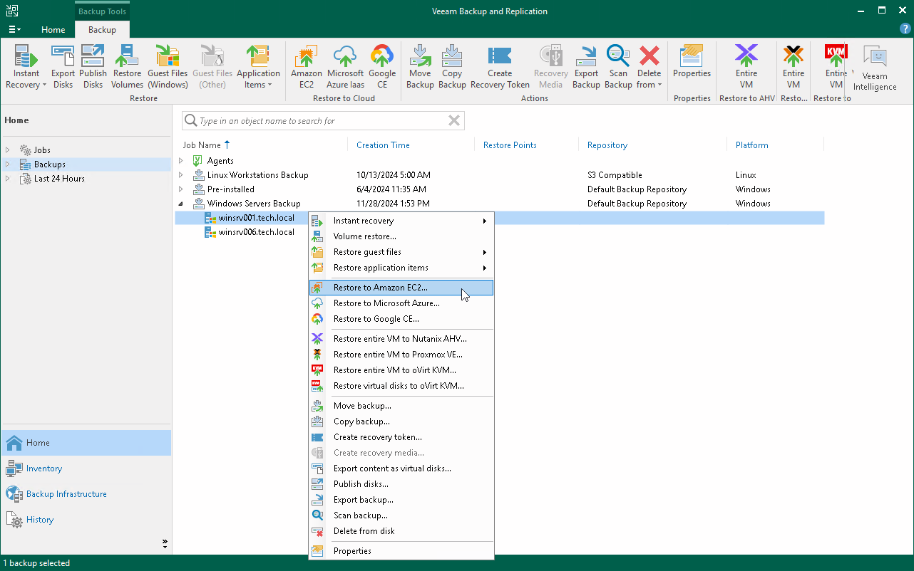 You can use the Veeam Backup & Replication console to restore computers from Veeam Agent backups to Amazon EC2.