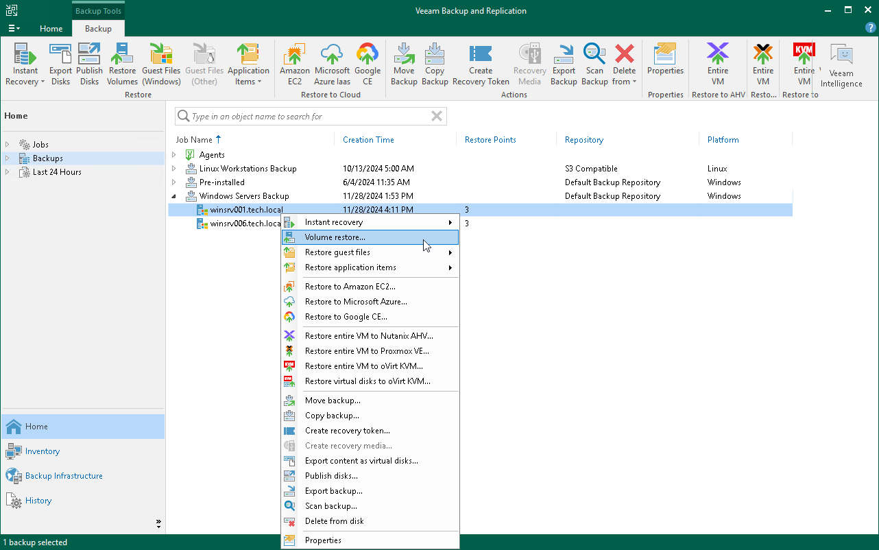 - Open the Home view. In the inventory pane, click the Backups node. In the working area, expand the necessary Veeam Agent backup, select the necessary computer in the backup and click Restore Volumes on the ribbon or right-click the computer and select Volume restore. In this case, you will proceed immediately to the Restore Point step of the wizard.