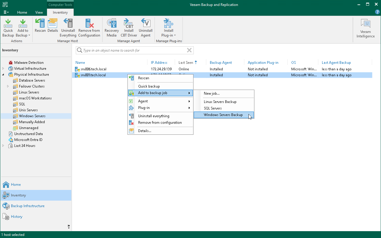 - In the inventory pane, in the Physical Infrastructure node, select a protection group whose computers you want to add to a Veeam Agent backup job and do one of the following: