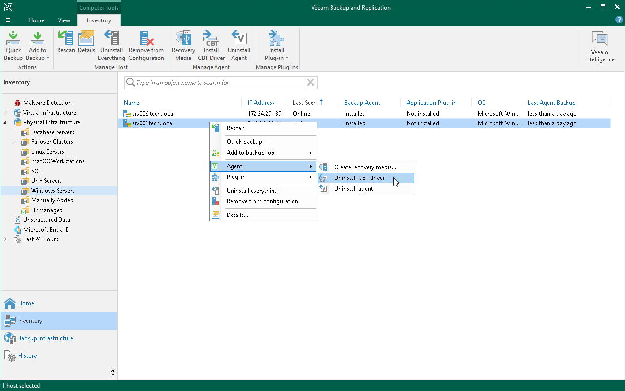 - In the working area, select the necessary computer and click Install CBT Driver on the ribbon or right-click the computer and select Agent > Install CBT driver.