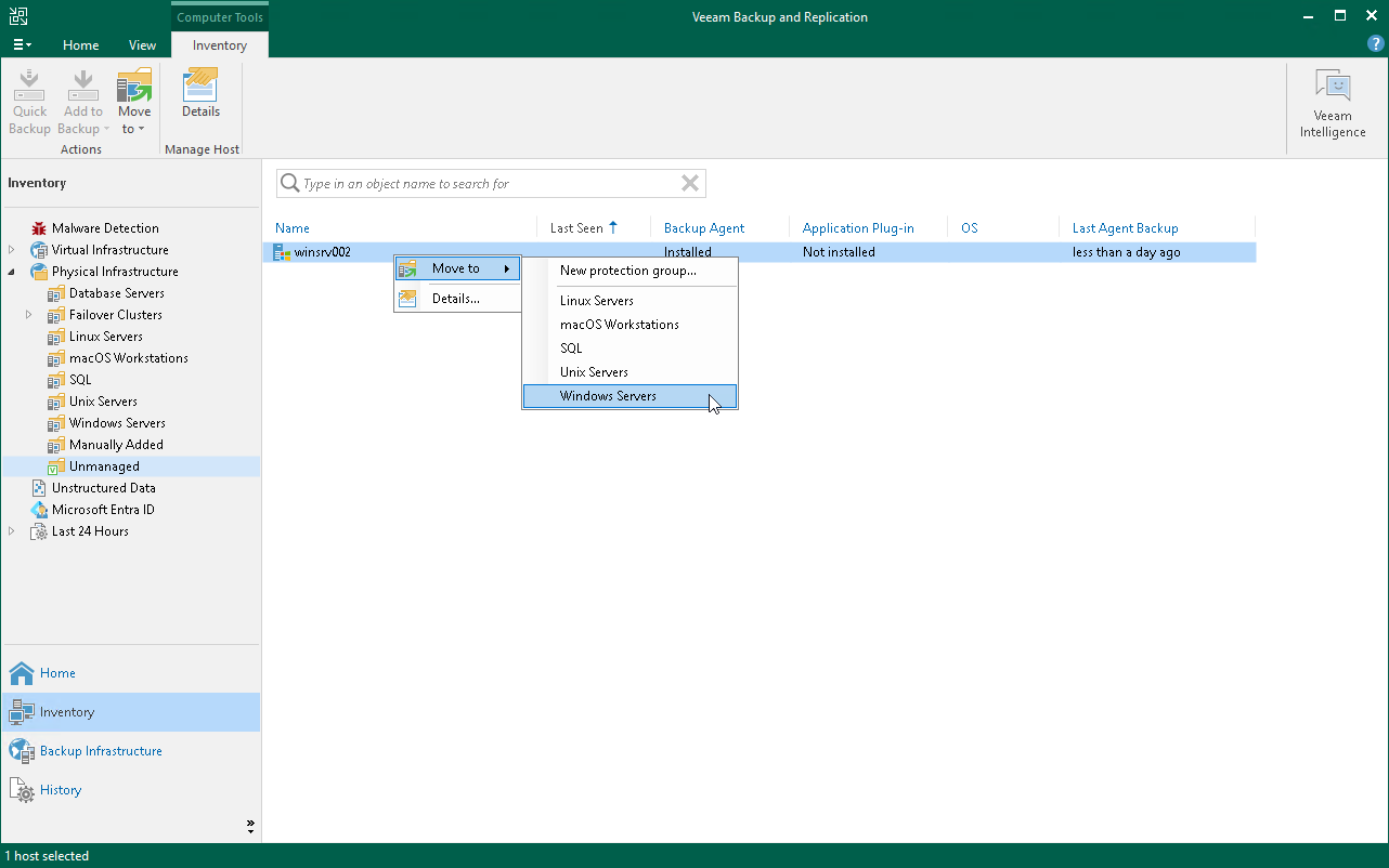 - In the inventory pane, expand the Physical Infrastructure node and select the protection group that includes the Veeam Agent computer that you want to move.