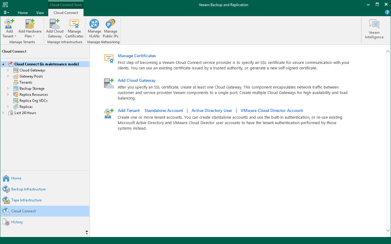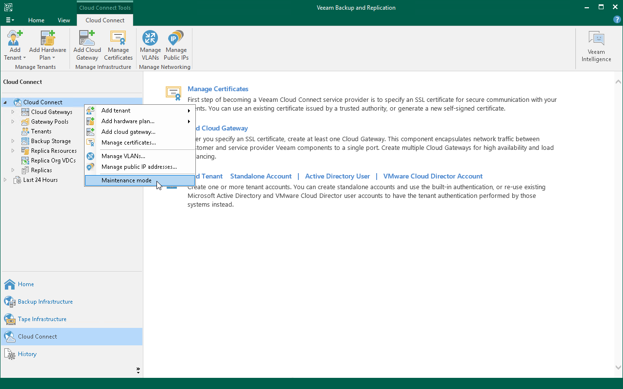 To bring the SP backup server back to the normal operational mode, right-click the Cloud Connect node and select Maintenance mode once again.