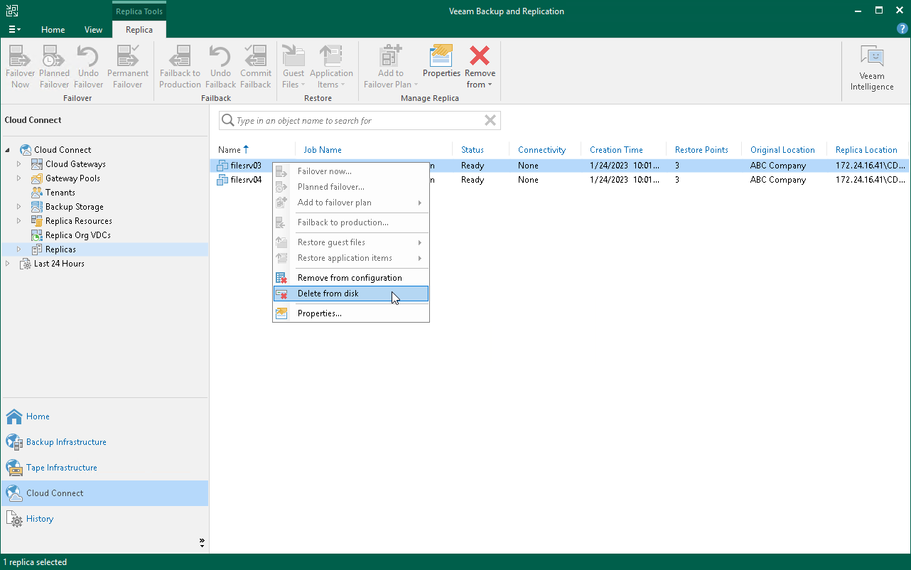Do not delete tenant VM replicas from the cloud host manually. Use the Delete from disk option instead. If you delete VM replicas manually, subsequent replication job sessions will fail.