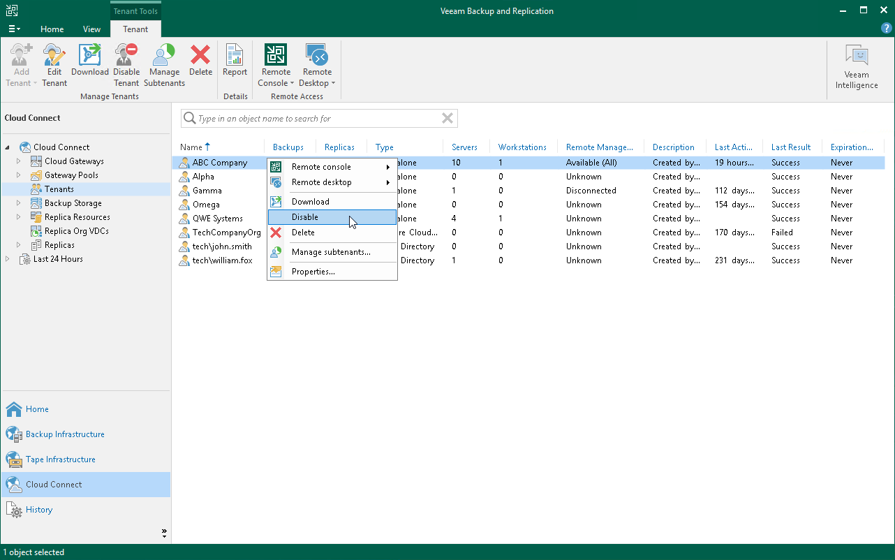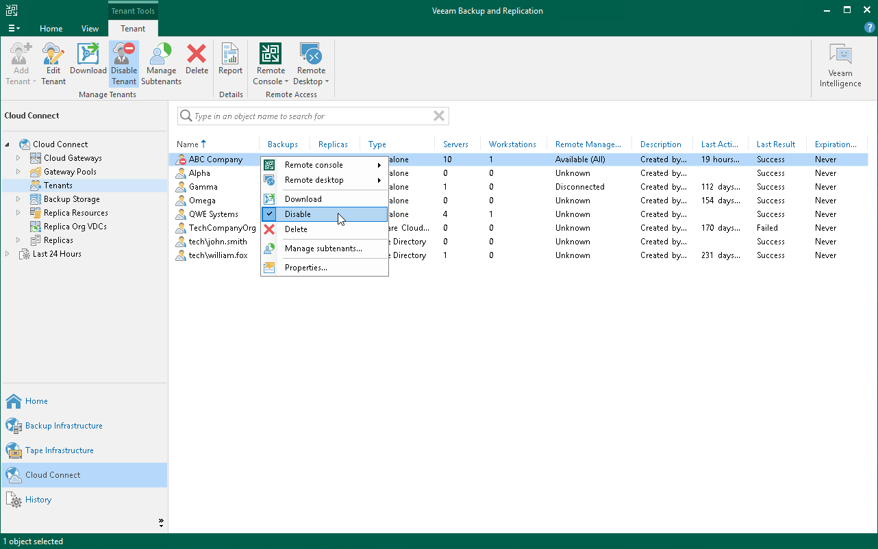- In the working area, select the tenant account that you want to disable and click Disable Tenant on the ribbon. You can also right-click the account in the working area and select Disable.