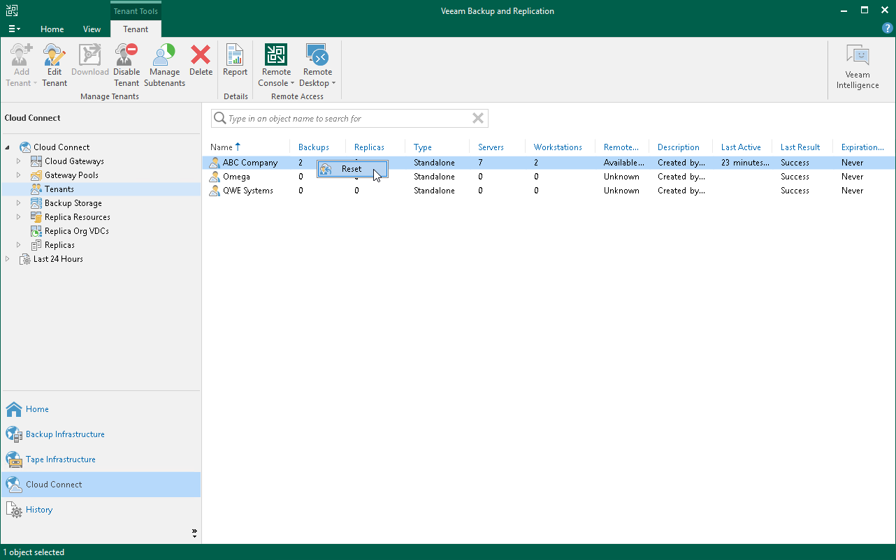 Machine count reset applies to the license only and does not remove information about tenant machines from the SP Veeam backup console. This lets the SP monitor tenant quota consumption. After the SP resets the tenant machine count, they can still view the number of machines processed by the tenant in the Tenants node of the Cloud Connect view. To learn more, see Viewing Tenant Account Information.