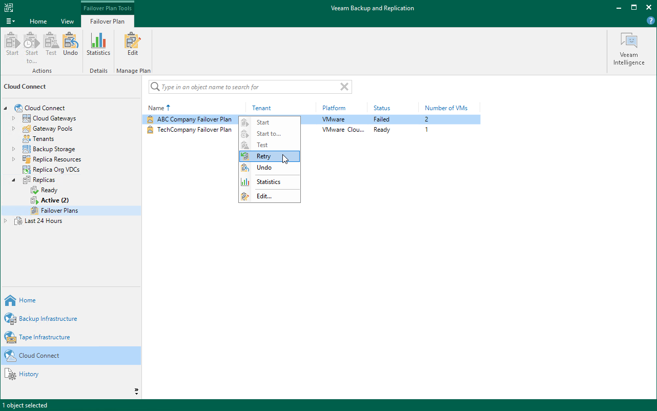 - In the working area, right-click the necessary cloud failover plan and select Retry.